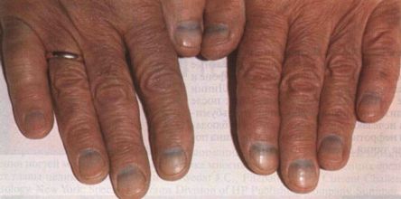 Nagi kļūst zili un zilganpelēki pretmalārijas preparātu, minociklīna, sudraba nitrāta iedarbības rezultātā. To cēlonis var būt arī hemohromatoze, Vilsona slimība un alkaptonūrija. Vilsona slimība - reta autosomāli recesīva pārmantojama slimība, kas raksturojas ar pārmērīgu vara uzkrāšanos aknās, smadzenēs, nierēs un citos orgānos un audos.