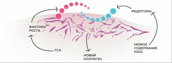 Par unikālu medicīnas atklājumu kļuva 33% TCA un ūdeņraža pārskābes apvienojums. Šīs divas substances darbojas šūnu līmenī, nodrošinot ļoti spēcīgu biorevitalizējošo efektu, nebojājot ādas virsmu: TCA – palielina fibroblastu aktivitāti, savukārt ūdeņraža pārskābe pastiprina receptoru jutību pret TCA.