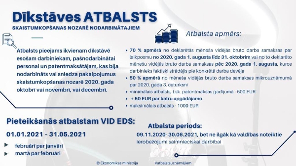 Pandēmijas skartajiem uzņēmējiem joprojām ir pieejams valsts finansiālais atbalsts, un tuvojas termiņš dīkstāves atbalsta un algu subsīdiju pieteikumu iesniegšanai par janvāri – VID EDS sistēmā atbalsta pieteikums ir jāiesniedz līdz 15. februārim. Attiecīgi par februāri pieteikšanās būs no 1. līdz 15. martam.