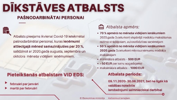 - Var pieteikties darba devēji, pašnodarbinātie un patentmaksātāji, kuru ieņēmumi no saimnieciskās darbības par konkrēto atbalsta mēnesi, salīdzinot ar mēneša vidējiem ieņēmumiem 2020. gada augustā, septembrī un oktobrī, ir samazinājušies vismaz par 20%.