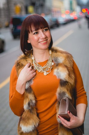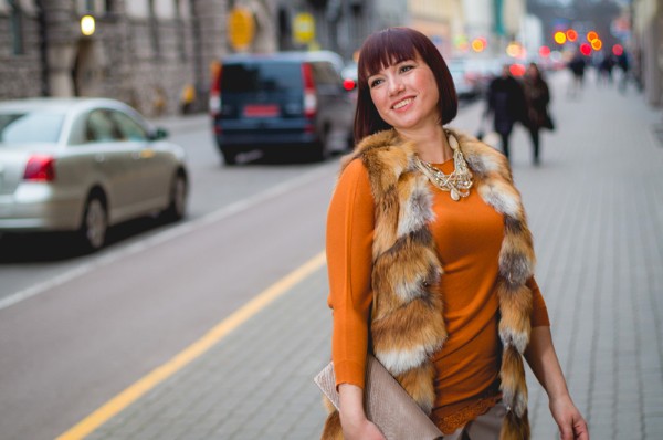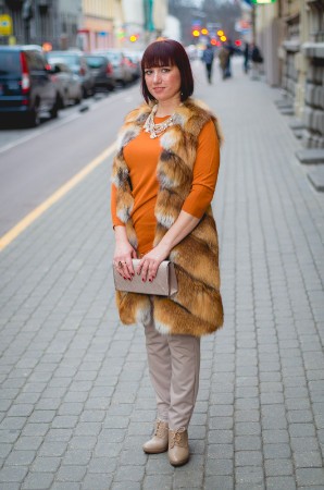 Jaunajai matu krāsai ļoti piestāv ķieģeļu krāsas toņi. Trikotāžas, brīva piegriezuma gaišu bikšu un kažokādas žaketes apvienojums ar rotām un augstajiem papēžiem piešķir casual tēlam glamūru un stilu.