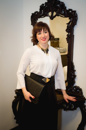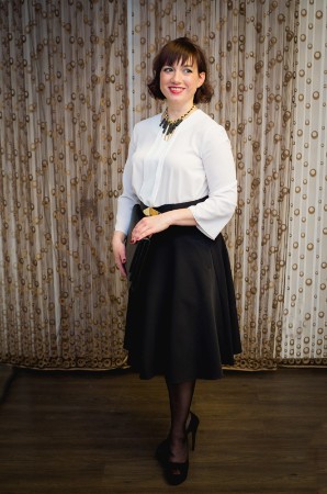 Oksanas profesija paredz nopietnas tikšanās, tāpēc viņas tēlam ir jāraisa uzticība un profesionalitāte. Klasiskais melnbaltais apvienojums vienmēr izskatās ļoti svinīgi un stingri, bet cirtas, kuras mēs pievienojām Oksanas frizūrai, padara tēlu maigāku. Platā josta izceļ tievo vidukli. Klačs un rotas piešķir tēlam pabeigtību.