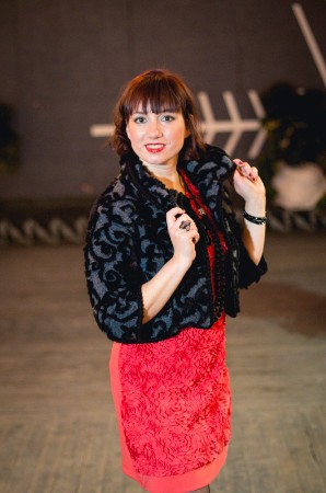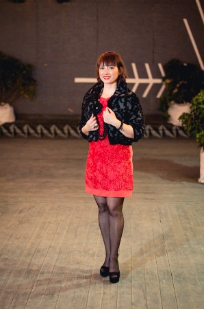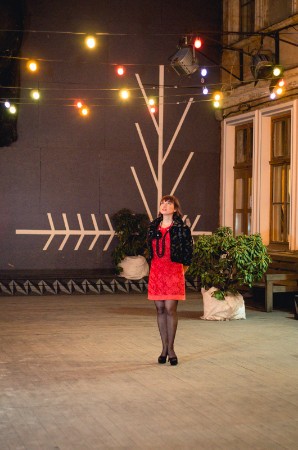 Kleita klasiski sarkanā krāsā, bet kura izceļas ar interesanto faktūru un zīmējumu. Neliela melna žakete, kura atkārto kleitas zīmējumu, bet ir jau daudz svinīgāka. Apaļā žaketes apkakle rotaļājas ar loku izliekumiem. Augstā kurpju platforma pagarina kājas un padara tās vel slaidākas. Šādā svētku tērpā var ne tikai dejot Jaungada ballē, bet arī vērot salūtu.