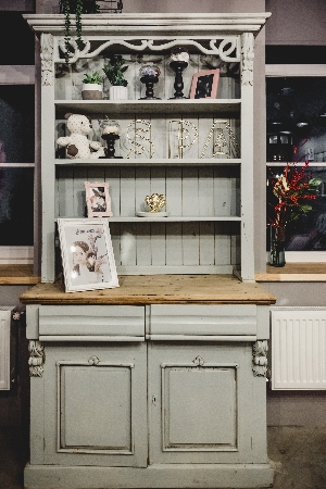 Хозяйка салона любит старые вещи, она с удовольствием дает им вторую жизнь. Настоящая находка – прикрепленные к стене старые металлические ящики для бутылок, которые мы все помним из советского прошлого. Некая дама отдавала банки, которые хранились в этих ящиках, вместе с самими ящиками. Отказаться от банок не получилось. Пришлось найти того, кому эти банки нужны, и тогда ящики были очищены, покрашены и теперь используются как стильные места для хранения в салоне. Также в самых разных невероятных местах были найдены и другие предметы интерьера.