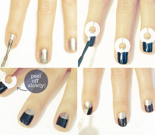 6) Покрываем ногти темным лаком. Сначала делаем тоненькой кисточкой границу, а затем закрашиваем вторую часть ногтя темным лаком. Для "лунного" маникюра необходимо наносить лак от краев к центру, а не наоборот, как при обычном маникюре. Для комфорта можно использовать шаблон, который закрывает "лунную" кромку.