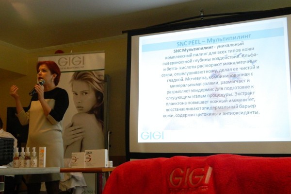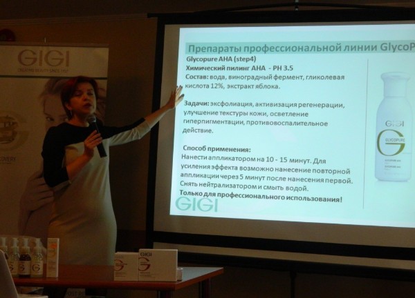 Semināra laikā Svetlana Smolansky iepazīstināja klātesošos speciālistus ar dažādajām GIGI kosmētikas līnijām, katras līnijas unikālajām īpašībām, iedarbību un lietošanas īpatnībām, atkarībā no ādas tipa un stāvokļa.