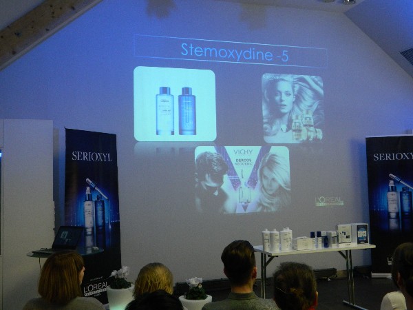 Foto: Par Serioxyl sistēmu stāsta L’Oréal Professionnel apmācību menedžere Baltijas valstīs Diāna Isajeva un Serioxyl oficiālais zinātniskais eksperts Mg. biol. Romāns Vēveris.