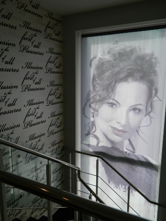 Uzmanību piesaista samtainās tapetes ar uzrakstiem. Izvēli noteica fakts, ka tās ideāli iederas salona koncepcijā. Kas tieši uz tām ir rakstīts, tika izlasīts tikai pēc iegādāšanās: Illusion is the first of the pleasure (ilūzija – pirmā no baudām). Pārsteidzoši, cik precīzi sasaucas šie vārdi ar galveno ideju un darbu. Skaistums arī ir ilūzija, kurš tiek veidots salonā, un tas sagādā baudu. Pasaules iluzoriskums atspoguļojas tapetēs.